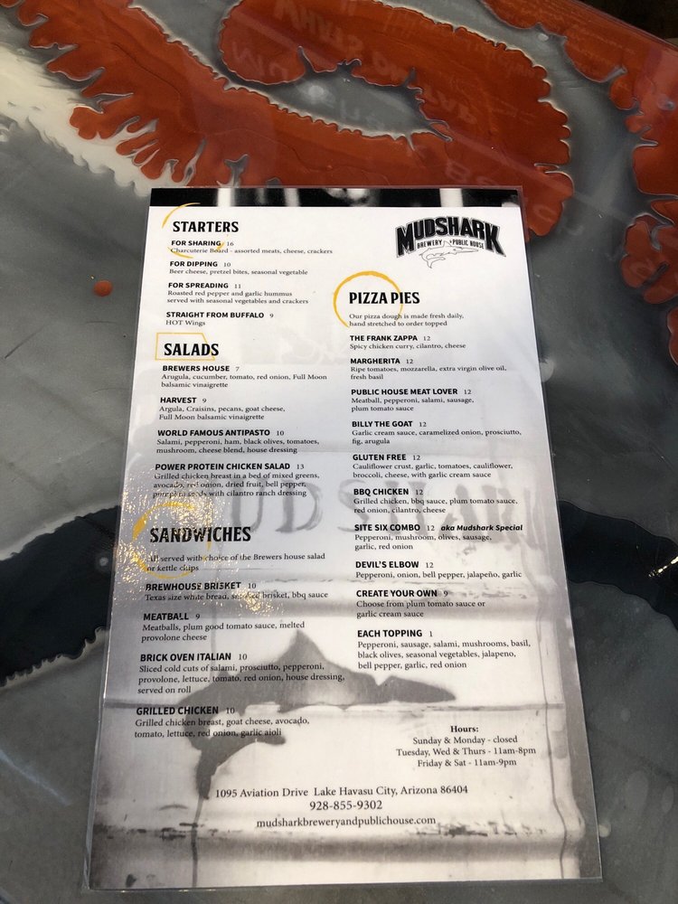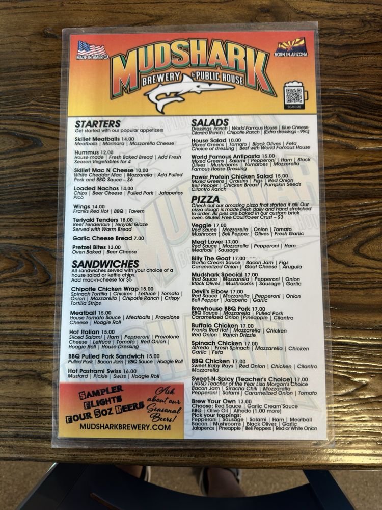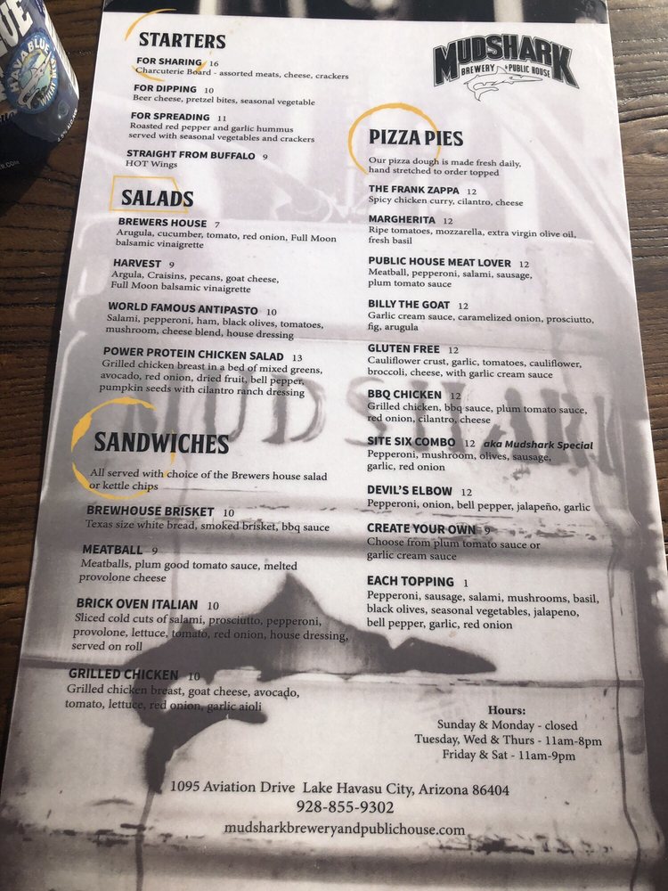 Welcome to Mudshark Brewery and Public House, a hidden gem located at 1095 Aviation Dr in Lake Havasu City, AZ. Our menu showcases an array of mouthwatering options, from hearty sandwiches to delightful salads and artisanal pizza pies.